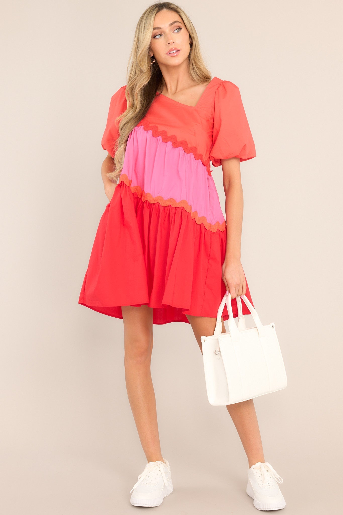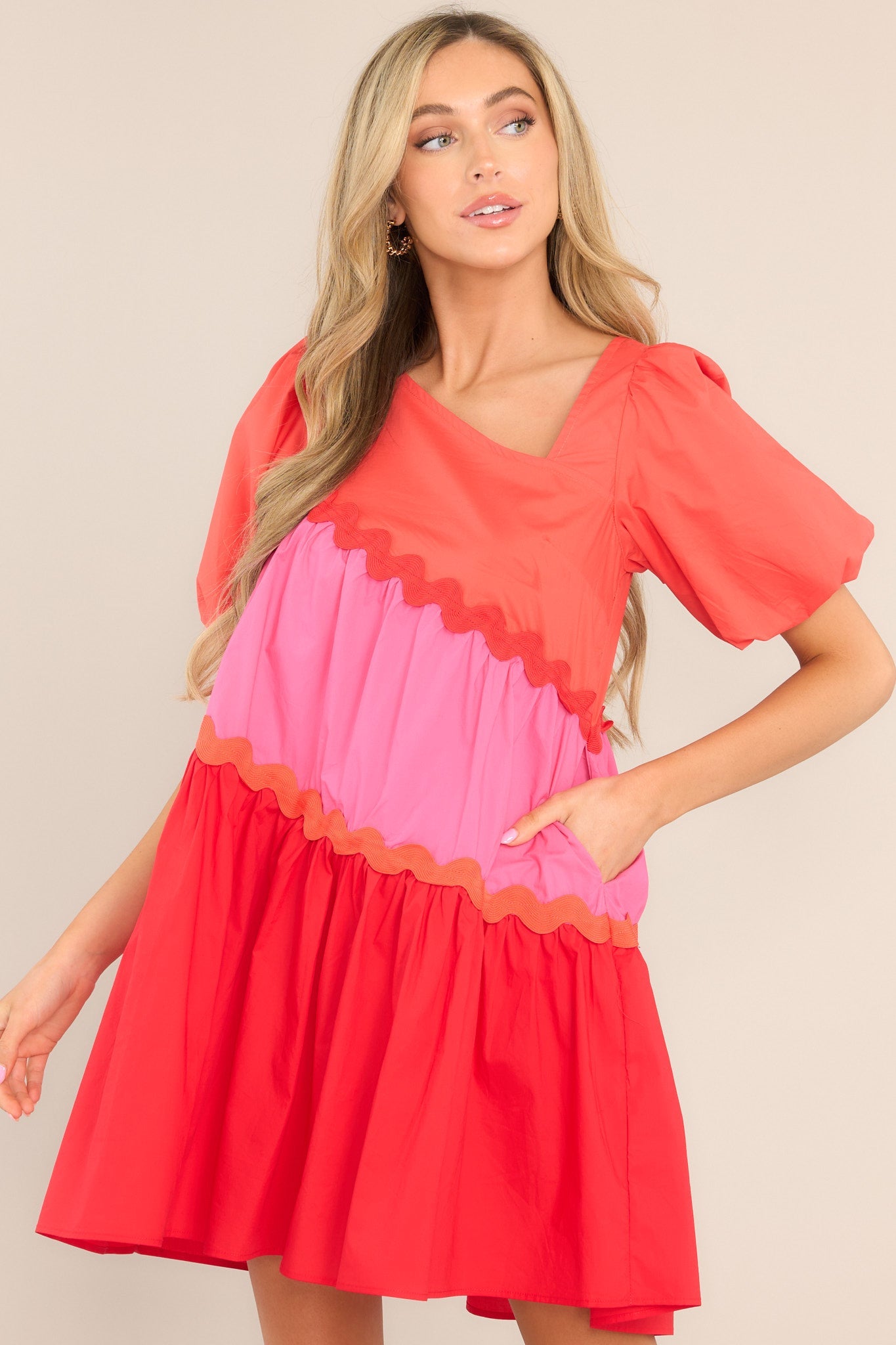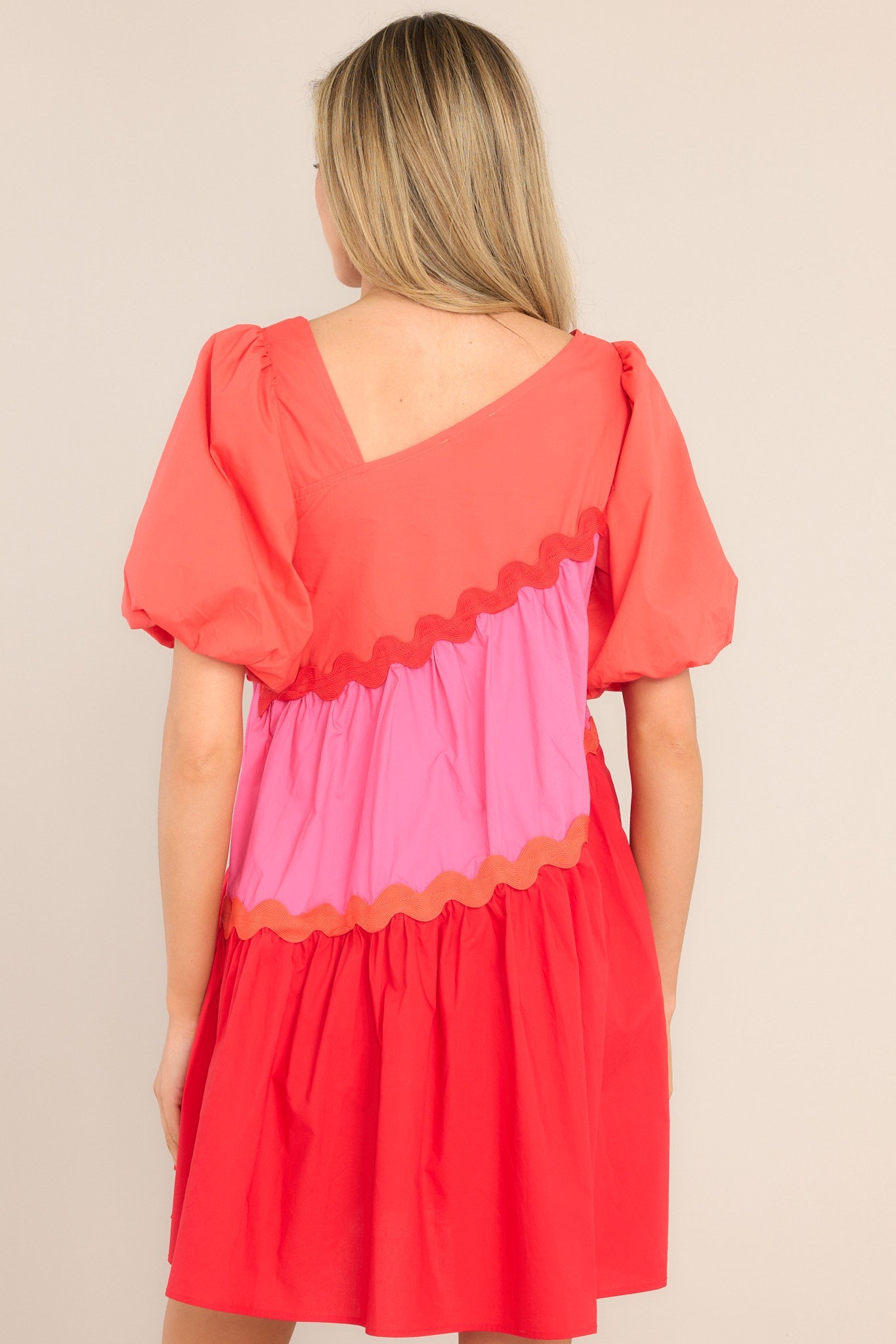 Be the life of the party in this super fun, multi-colored Everyone's Favorite Red Multi Rickrack Mini Dress! Look fabulous and stand out from the crowd with this one-of-a-kind statement piece. Get ready for lots of compliments! This dress features an asymmetrical neckline, puff sleeves with elastic cuffs, functional pockets at the waist, and a wide, exaggerated skirt.