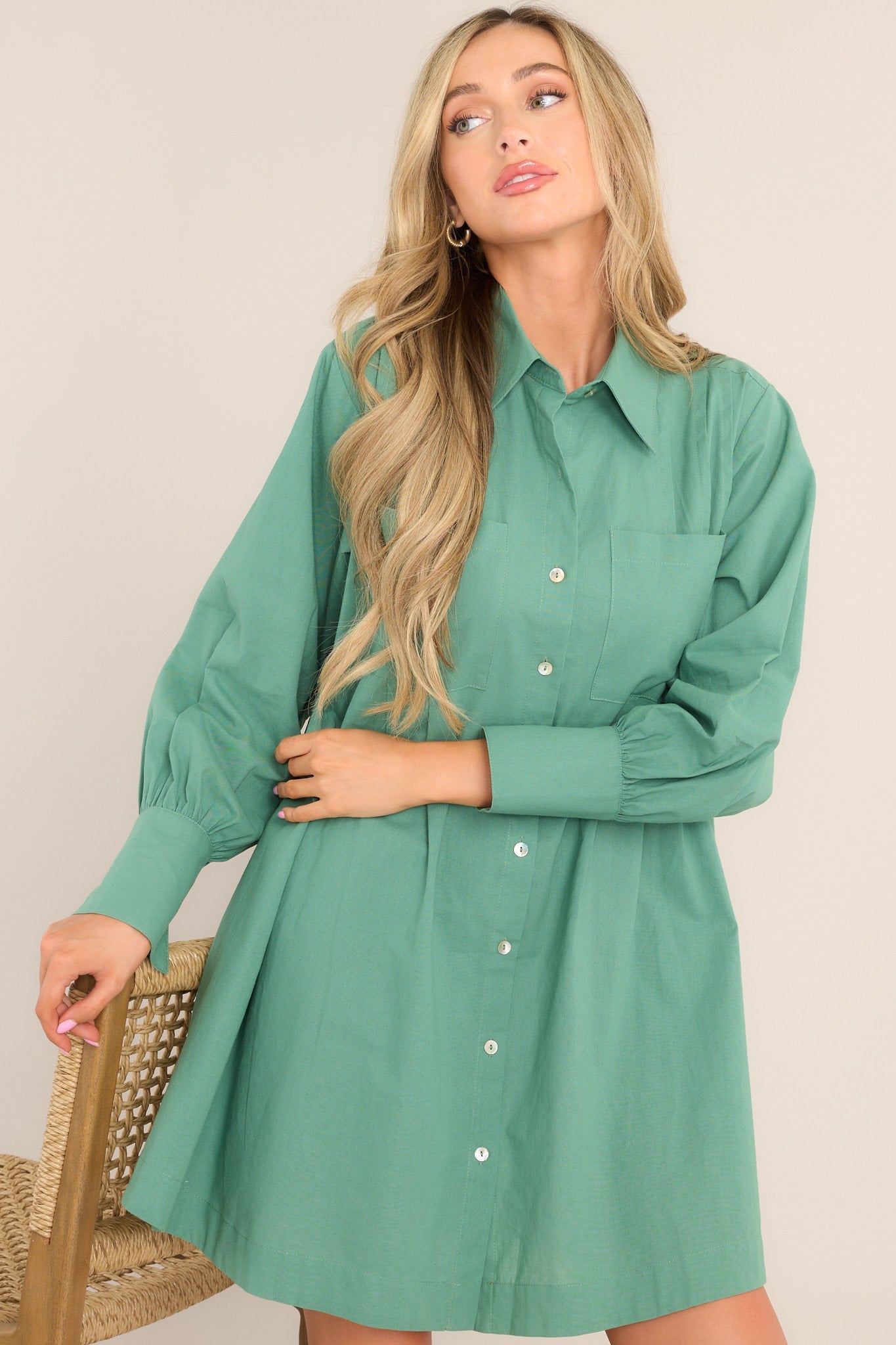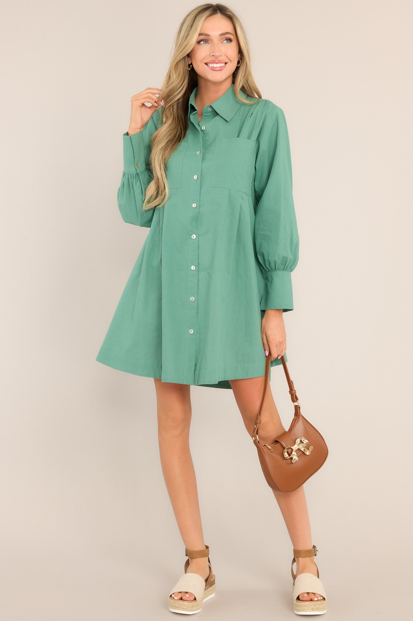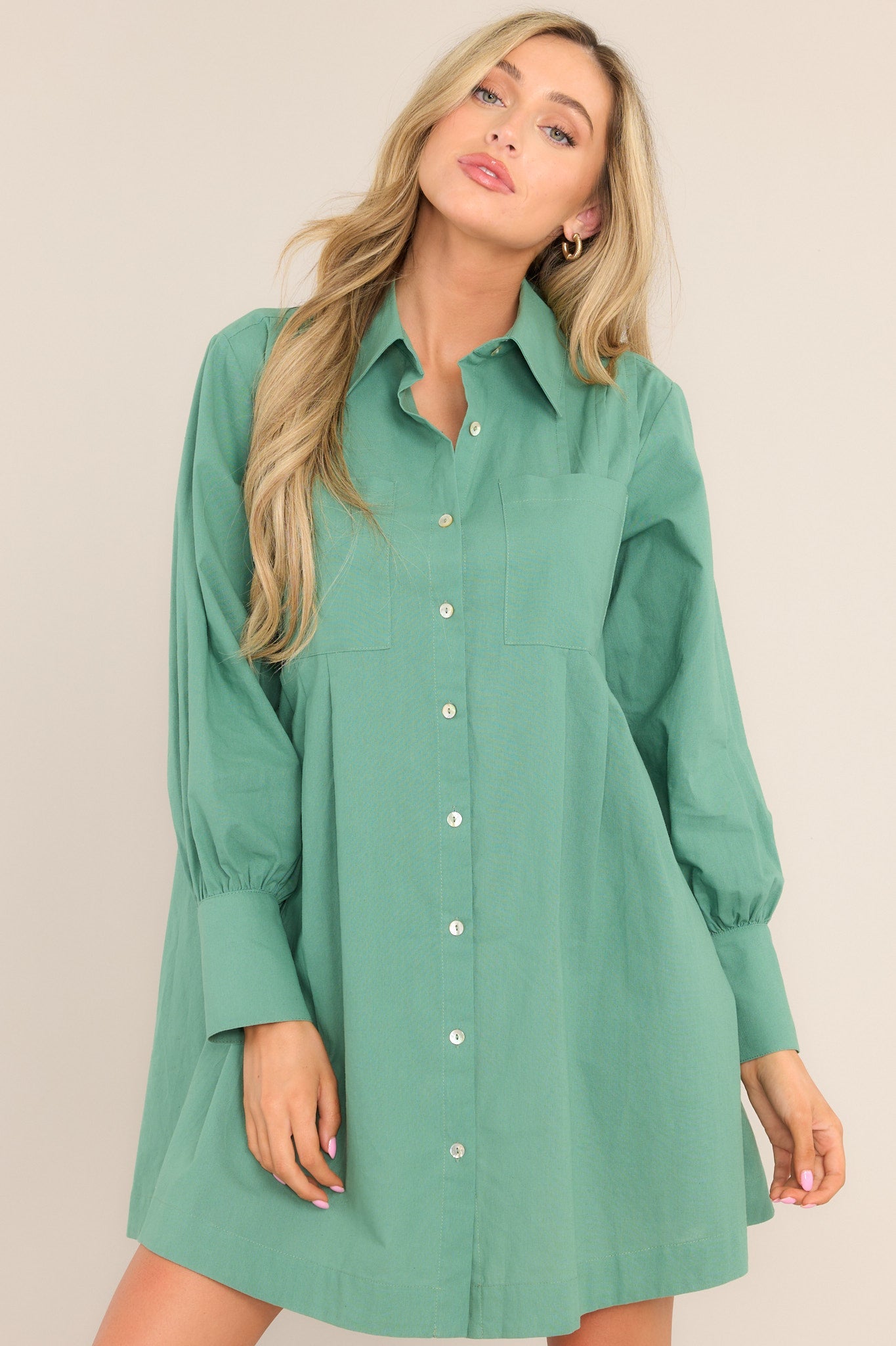 This casual button-down green dress is a real Game Changer, whenever you want to look flawless in the most relaxed way! You’re as cute as a button in this long sleeve mini…and I bet you know it! This dress features a collared neckline, functional buttons down the front, two front pockets, two side pockets, and pleated detailing.