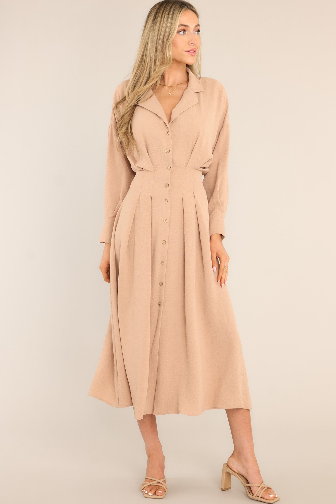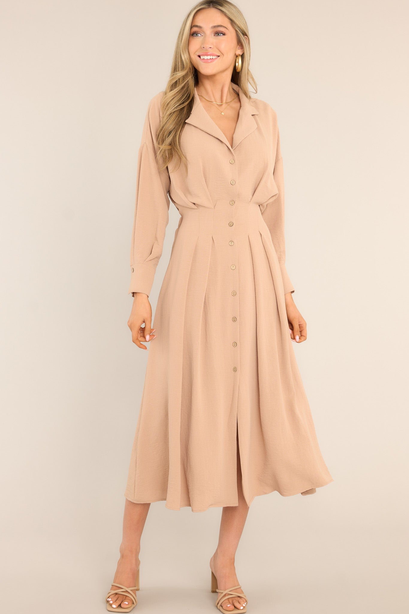 Get ready to cherish every moment in this super cute beige midi dress! The classic color, and button front details make it a versatile addition to your wardrobe. Whether you're dressing up or keeping it casual, this dress will make you feel effortlessly stylish. Don't miss out, add it to your collection now!