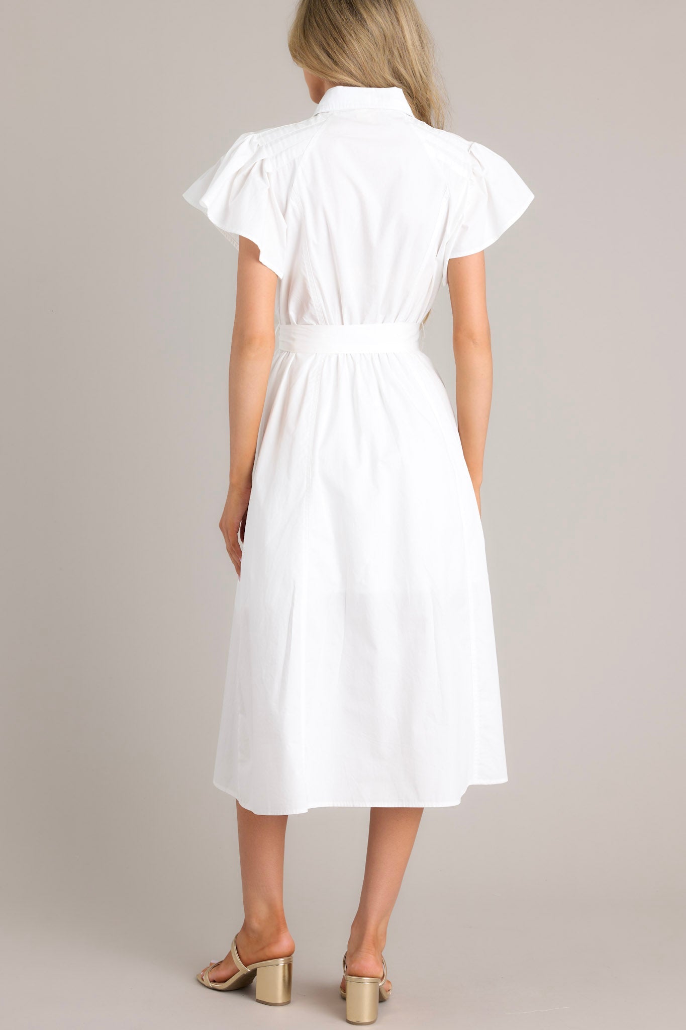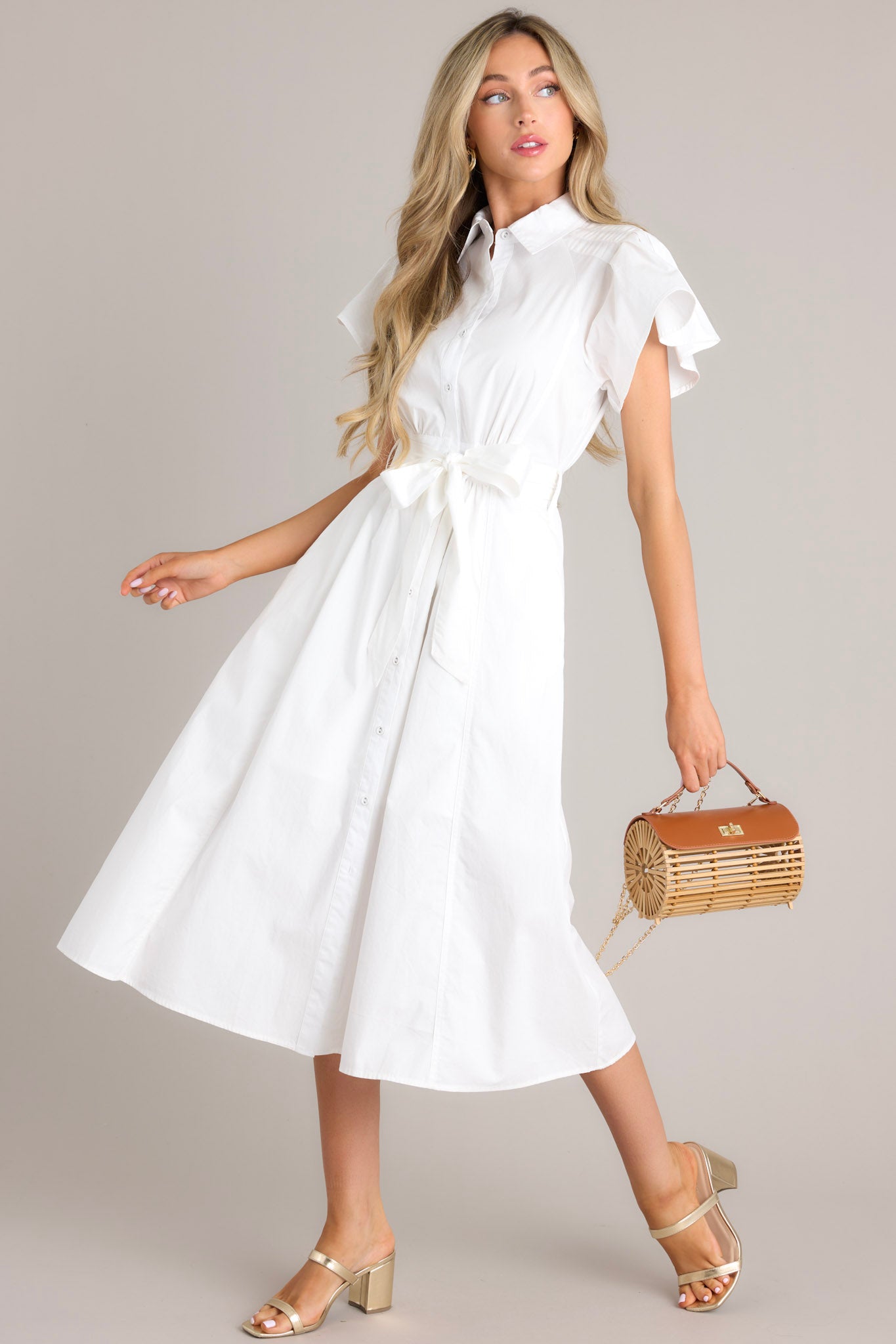 Unleash your fashion potential with the I Just Know White Button Up Midi Dress! It's not just a dress, it's a statement! This midi dress features a classic button-up design with a modern twist, making you stand out with confidence. Elevate your style game now! This dress features a collared neckline, functional buttons down the front, belt loops, a self-tie belt, hip pockets, front seams, and flutter sleeves.