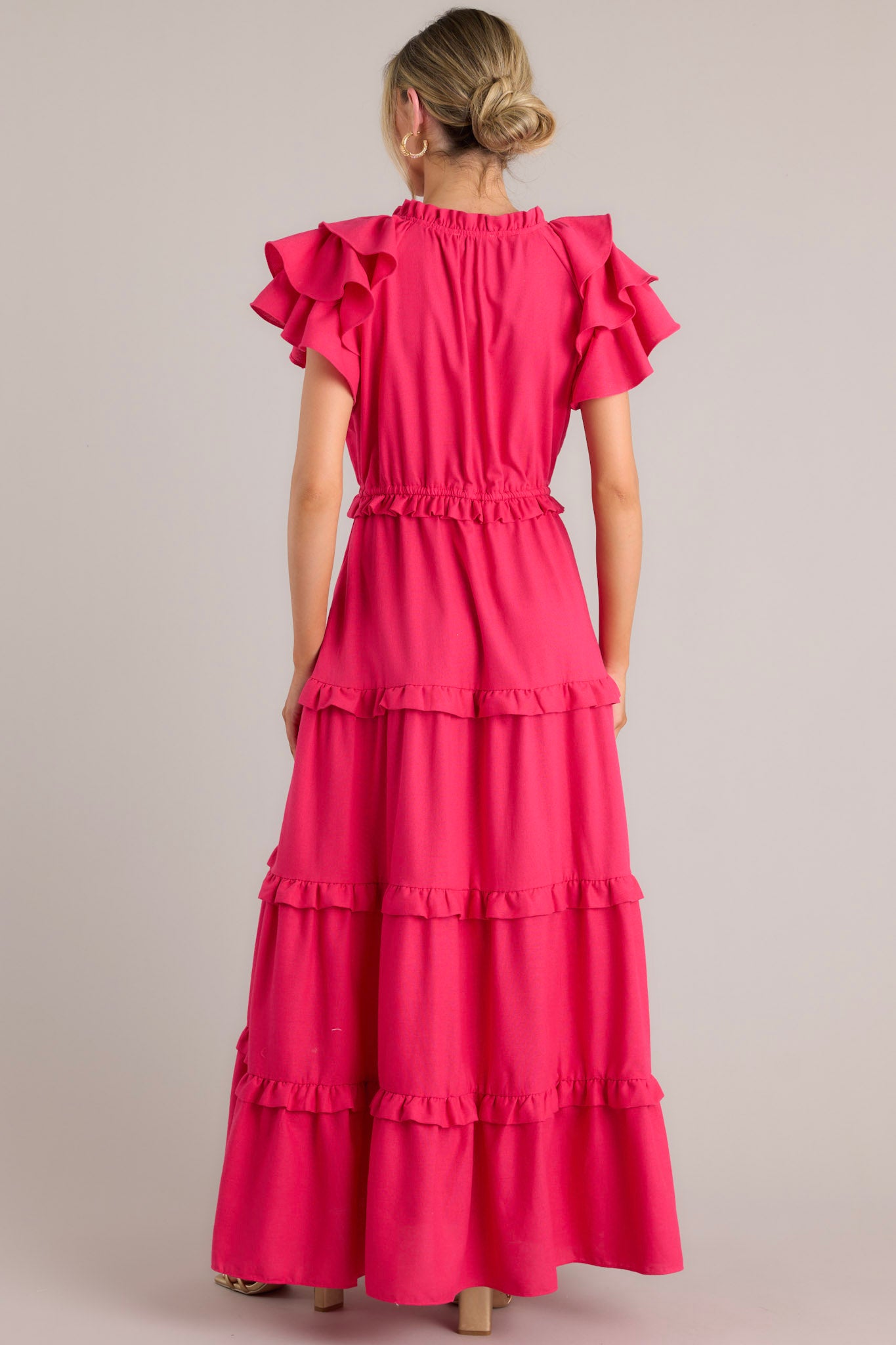 Slip into this Ruffle Some Feathers Lipstick Pink Maxi Dress and turn heads! Flowy and flirty, you'll be the life of the party, while still maintaining an air of elegance and grace. A statement piece sure to impress - it's time to get fluttering! This dress features a v-neckline with a self-tie closure, ruffled flutter sleeves, a drawstring waistband, and a long, flowy skirt. Model is wearing a small.