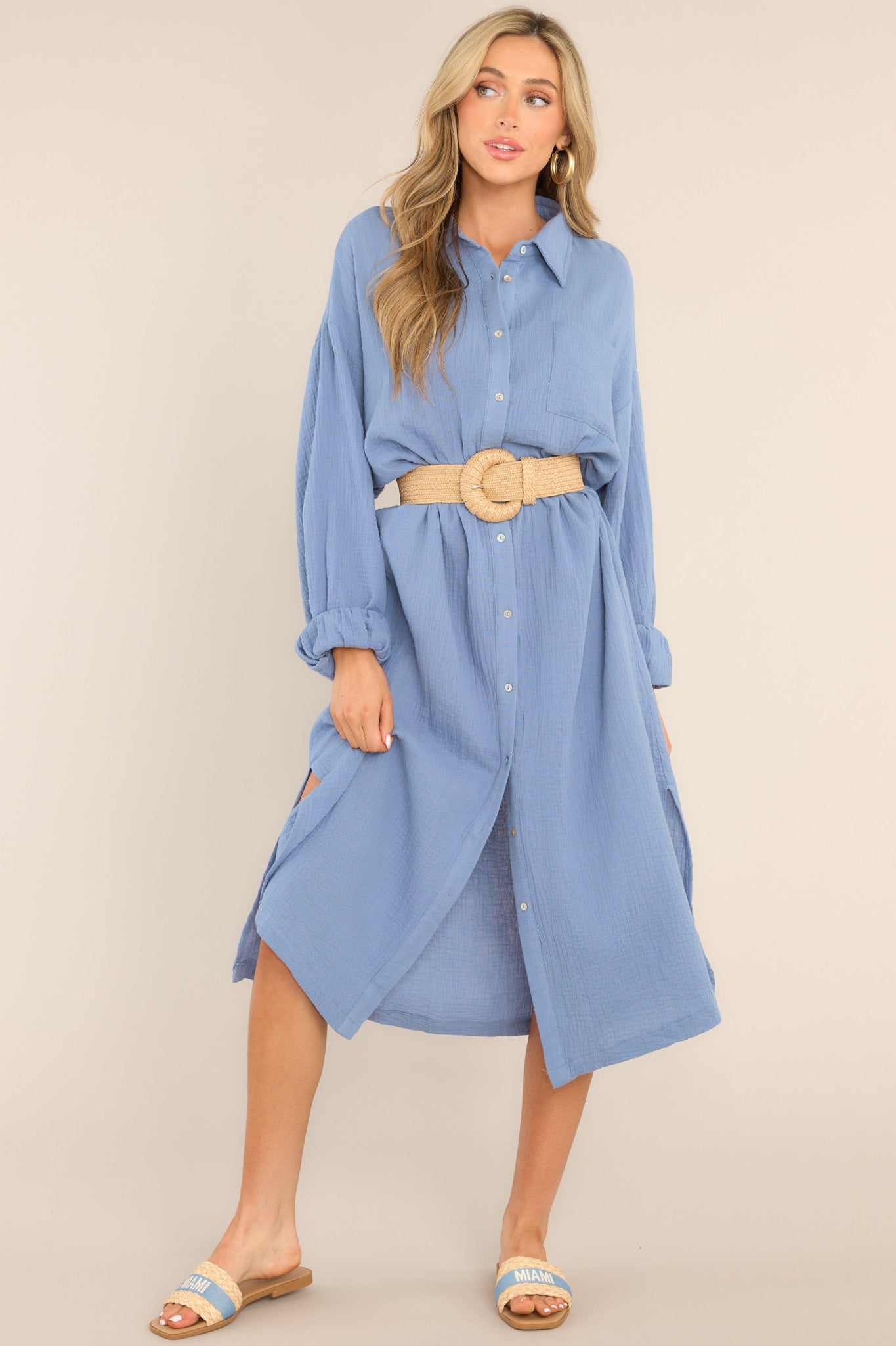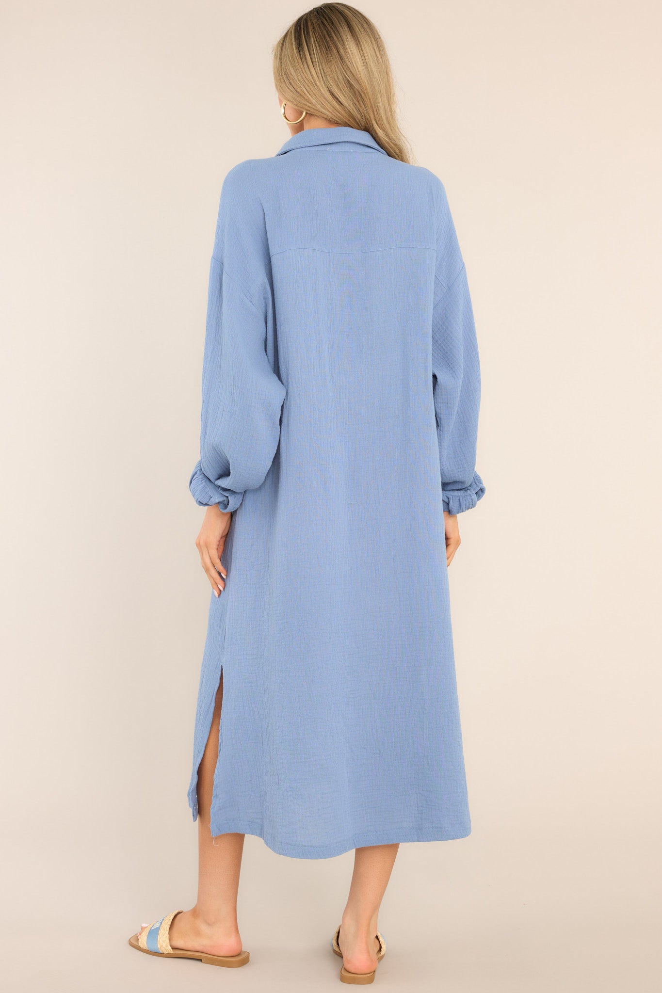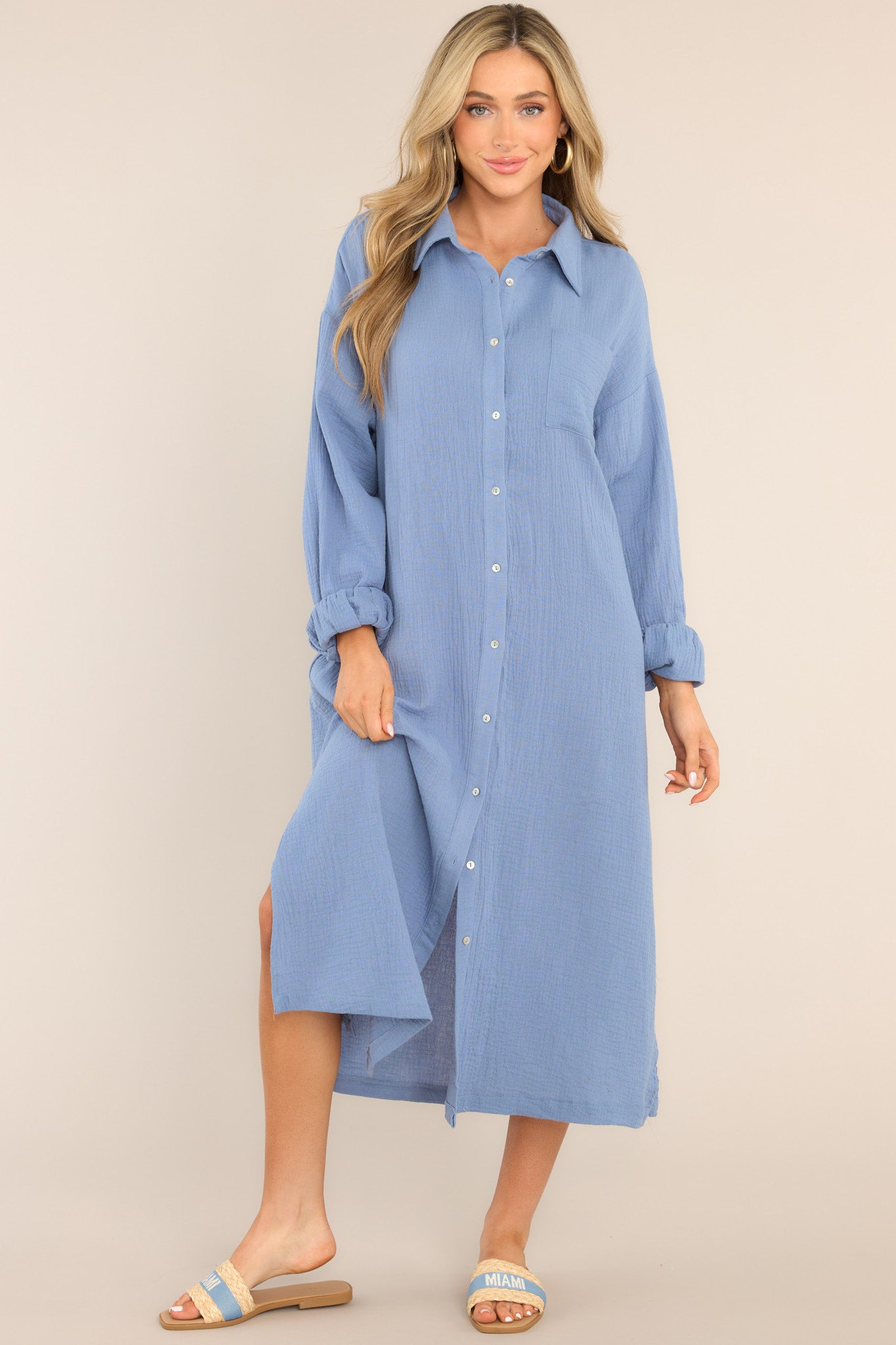 Get ready to soar in our Somewhere Up Above Blissful Blue 100% Cotton Midi Dress! Made with 100% cotton gauze, this dress will keep you feeling cool and comfortable while adding a playful pop of blue to your wardrobe. Perfect for a day out, with just the right amount of quirkiness! This blue midi dress features a collared neckline, a functional buttons, a breast pocket, long cuffed sleeves, and two slits on either side from the bottom hemline to just below the knee.