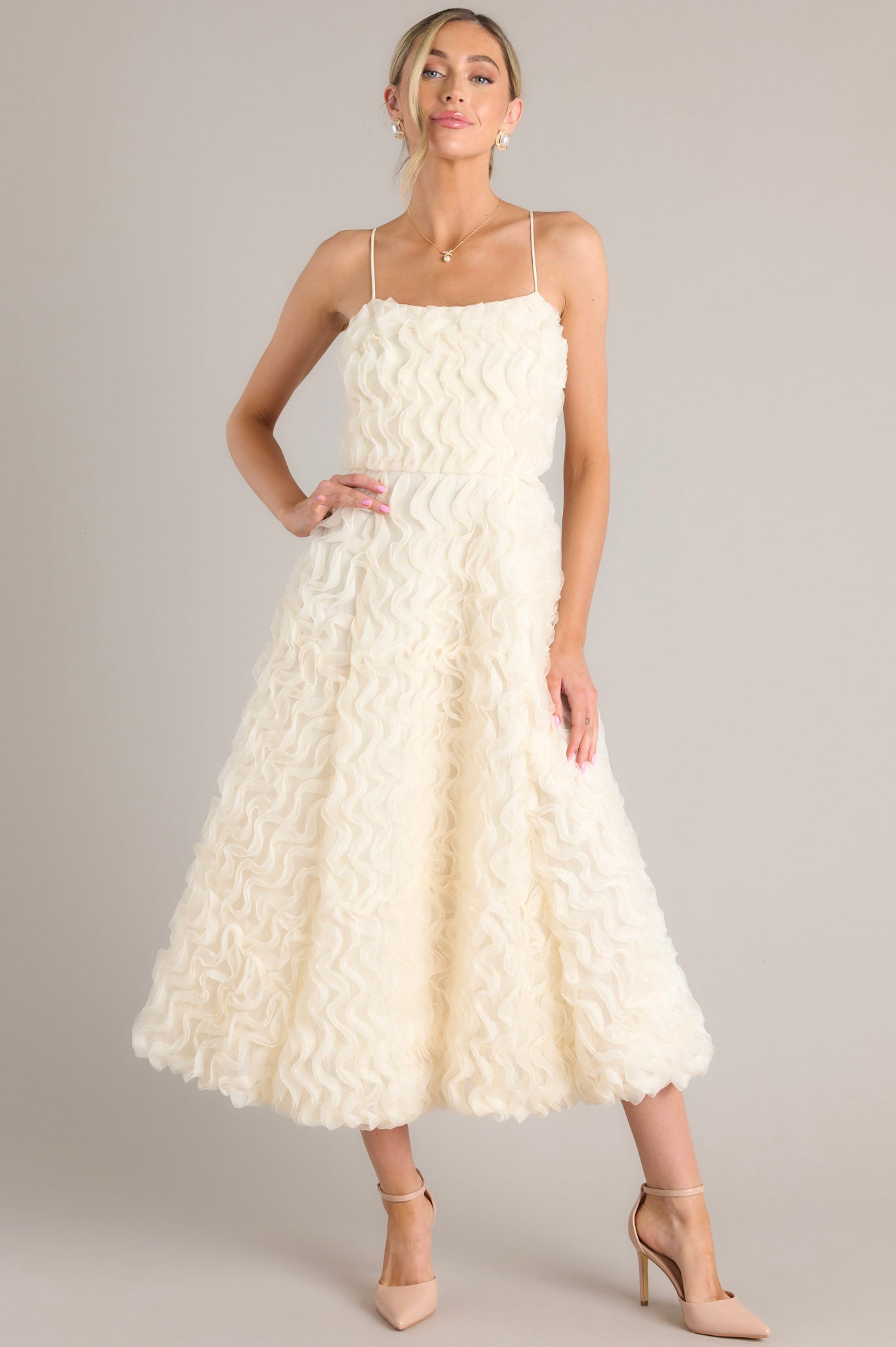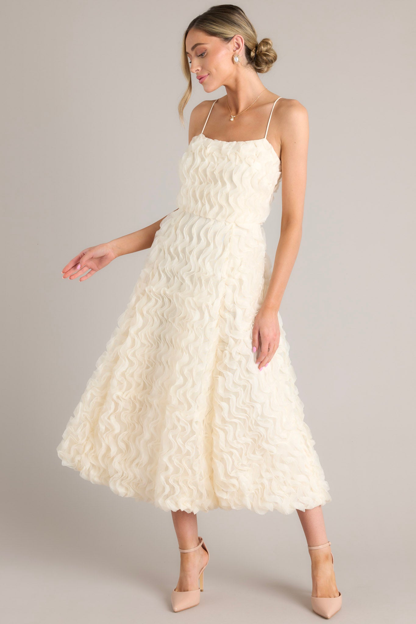 Get ready to wow in the Spectacular Magic Ivory Midi Dress! This dress is perfect for any occasion, offering unbeatable style that will leave you feeling confident and fabulous. From its elegant design to its versatile fit, this dress is guaranteed to make you stand out! This dress features a rounded neckline, thin straps, a functional zipper down the back, and a wavy, textured overlay. Belt is not included.