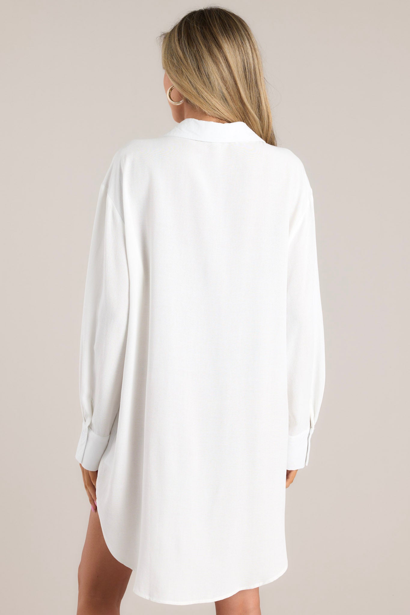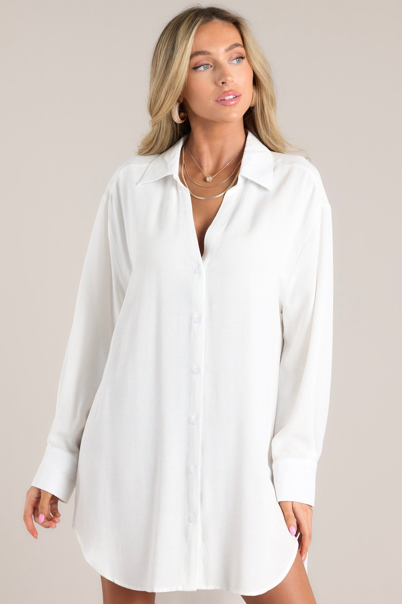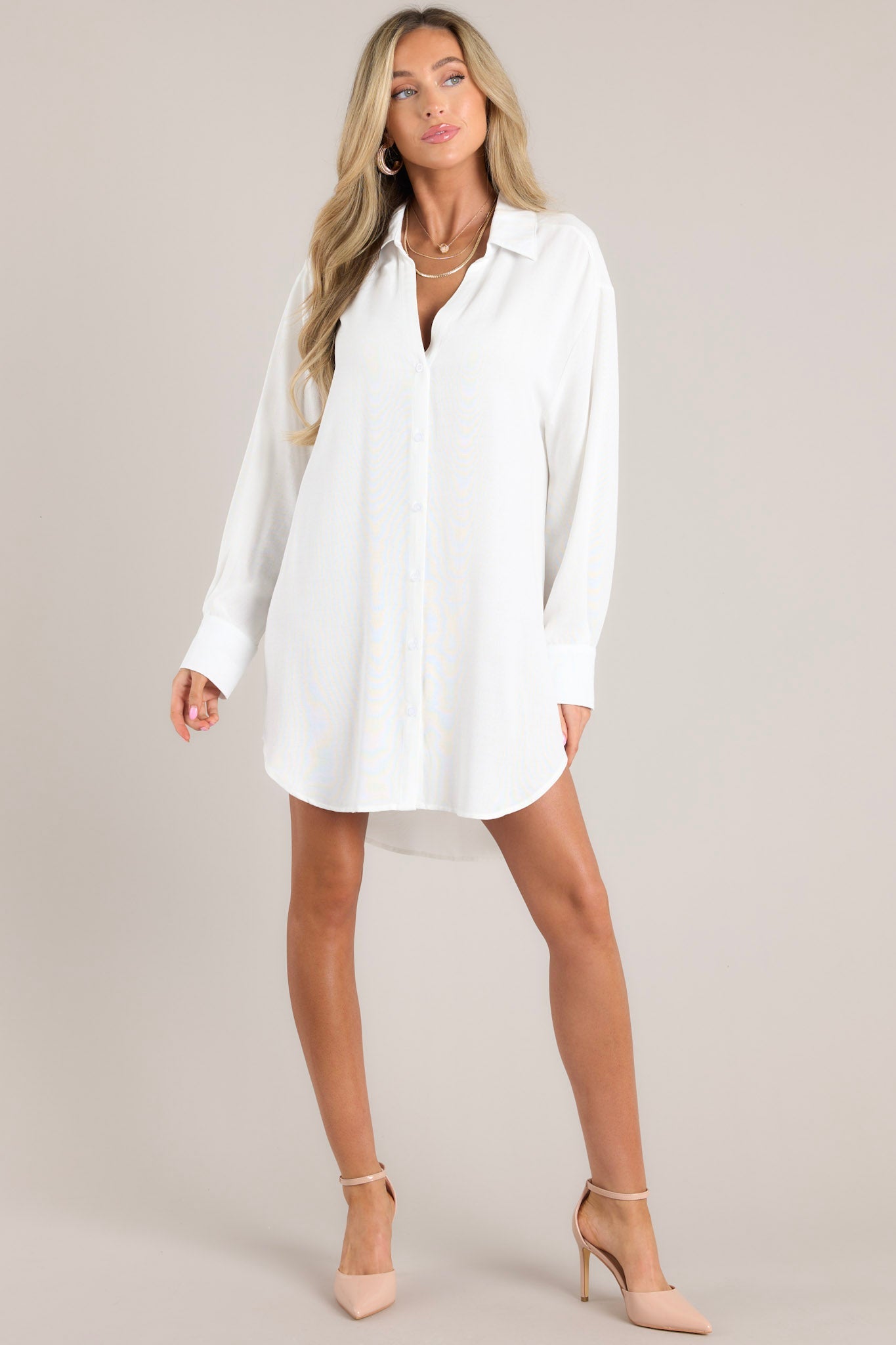 Be a trendsetter in this Chic Alternative White Button Front Shirt Dress! It’s the perfect go-to when you want to show off your style and stand out from the crowd. Show up to your next event looking sharp and chic in this stylish number! This tunic features a collared neckline, functional buttons down the front, long sleeves with buttoned cuffs, a scoop bottom hem, and a lightweight fabric.