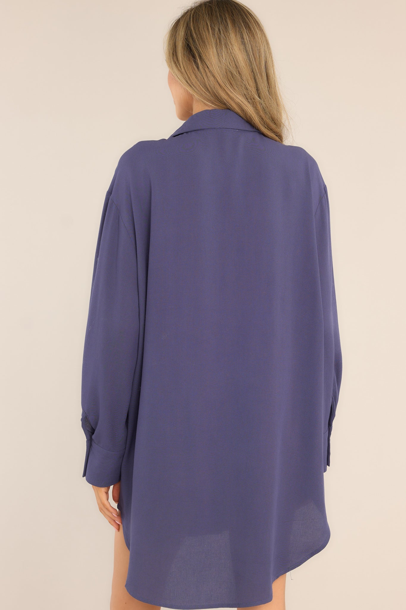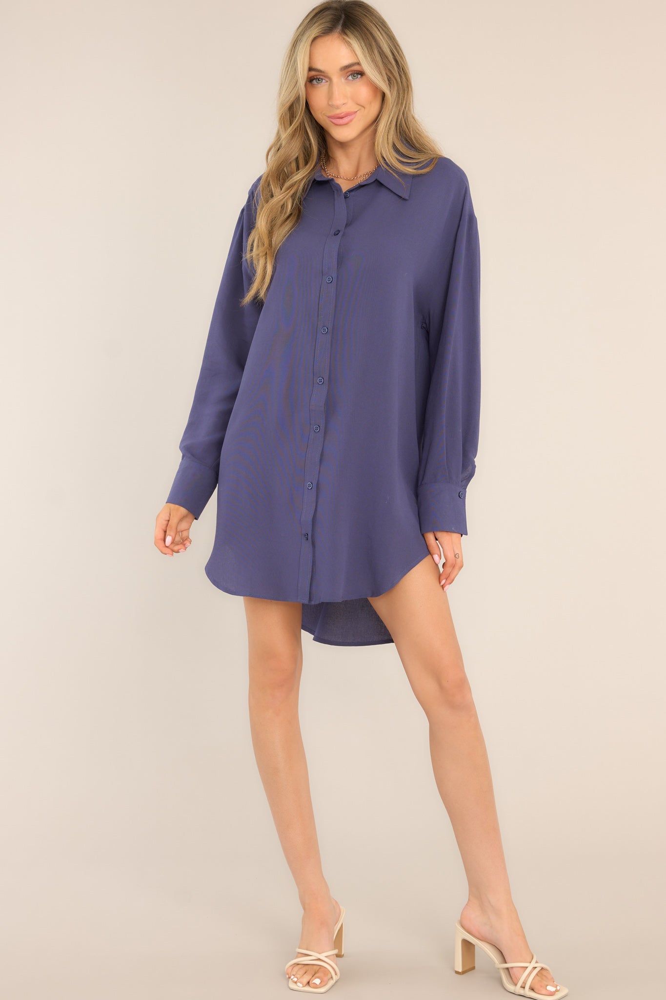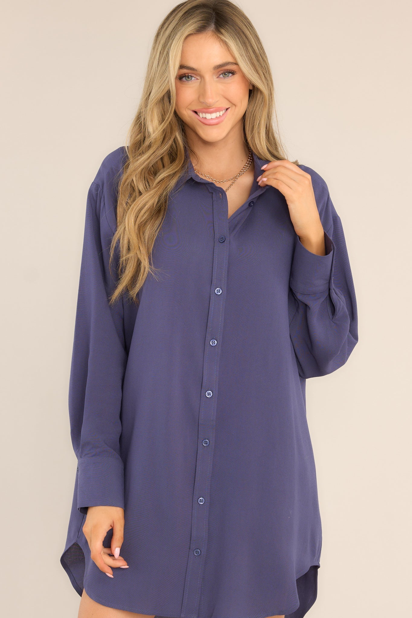 Navy blue shirt dress featuring a collared neckline, functional buttons down the front, long sleeves with buttoned cuffs, and a scoop bottom hem. This classic shirt dress is perfect for those days when you don't know what to wear.