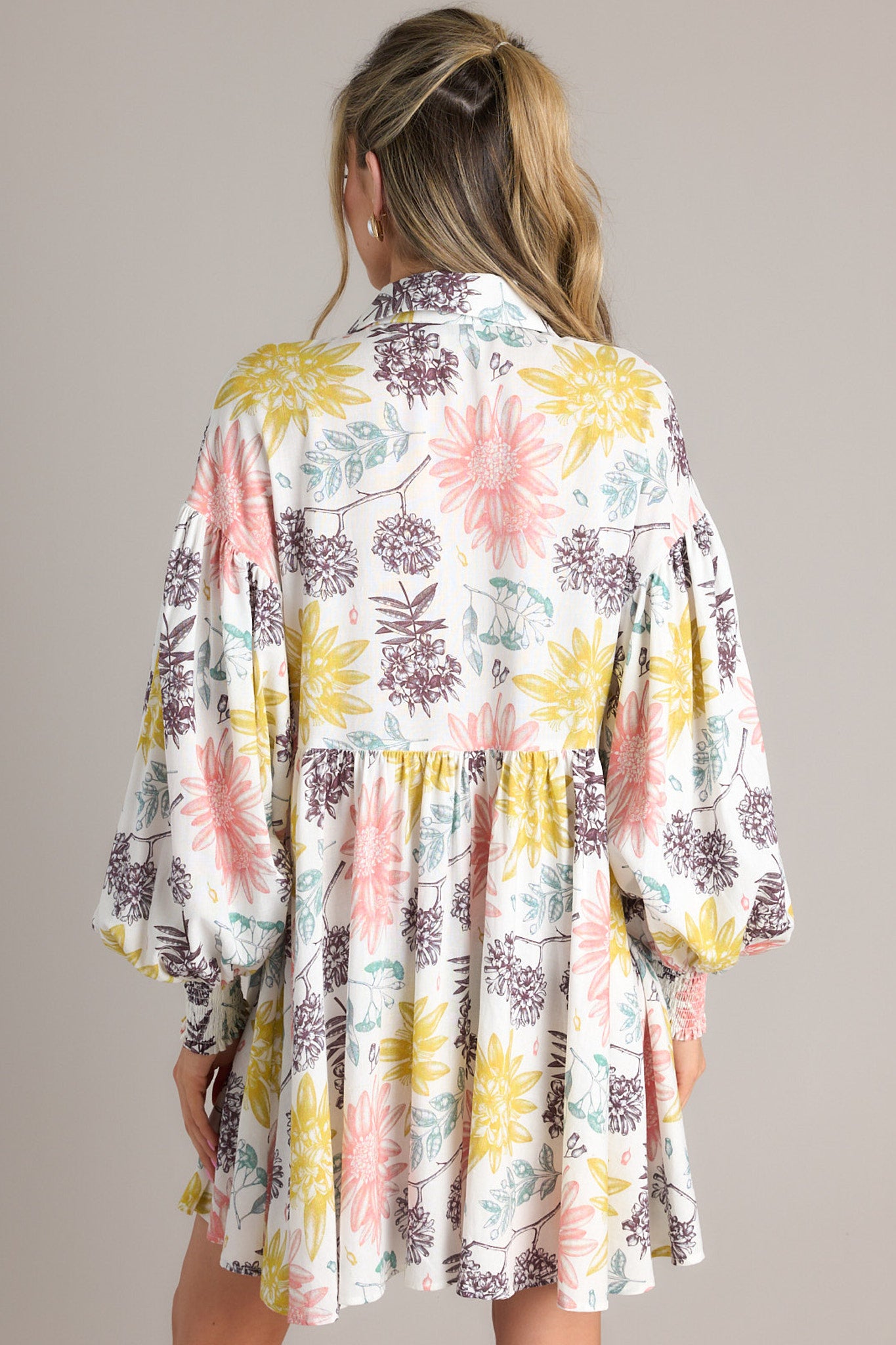 Put your best foot forward in this This Is Your Sign Ivory Floral Print Dress. Featuring a beautiful all-over pattern of pastel blooms, it'll make every day look like a special occasion. This dress features a collared neckline, functional buttons down the front, long balloon sleeves with smocked cuffs, and a flowy, relaxed fit throughout.